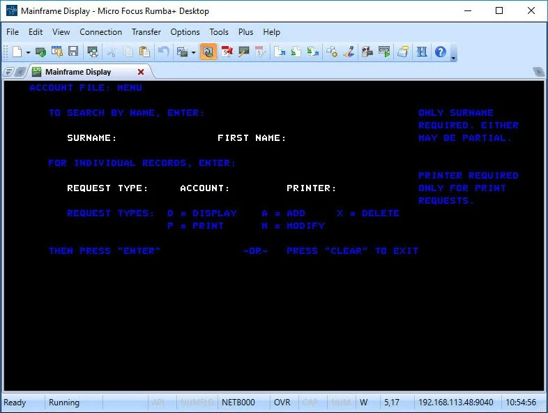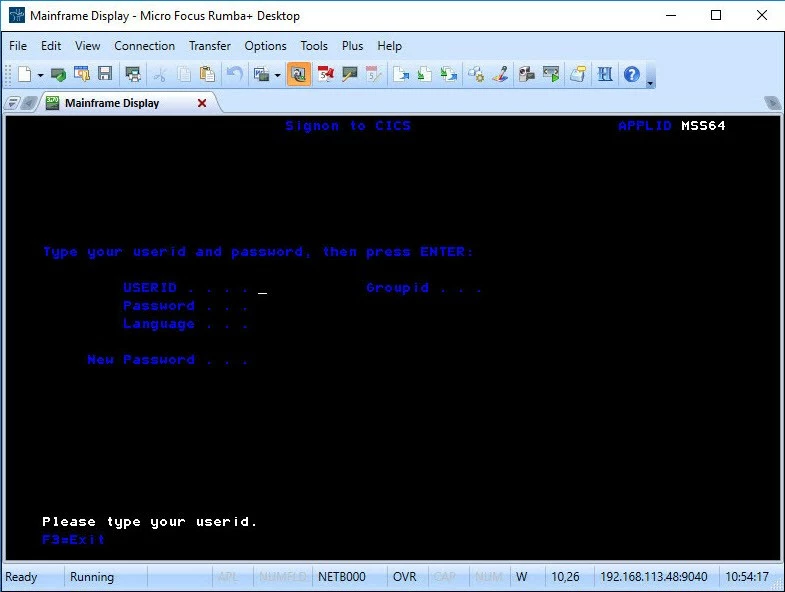 - Connect to the running container using a 3270 emulator. The instructions below assume you are using Micro Focus Rumba Desktop but you can use any 3270 emulator. If you are not using Micro Focus Rumba Desktop, create a 3270 connection with the IP address of the running container and port number 9040.