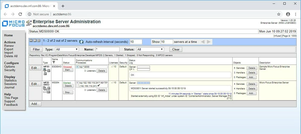 You can see that an enterprise server called MSS64 is running. That is the enterprise server where the ACCT demonstration application is running.