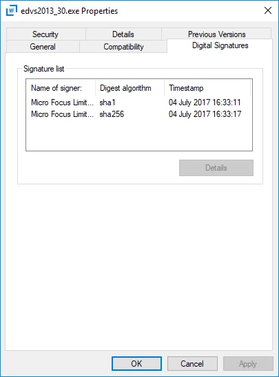 Additionally, the Digital Signing Timestamp can be examined. This is visible from the ‘Digital Signatures’ tab of the Installer EXE Properties e.g: