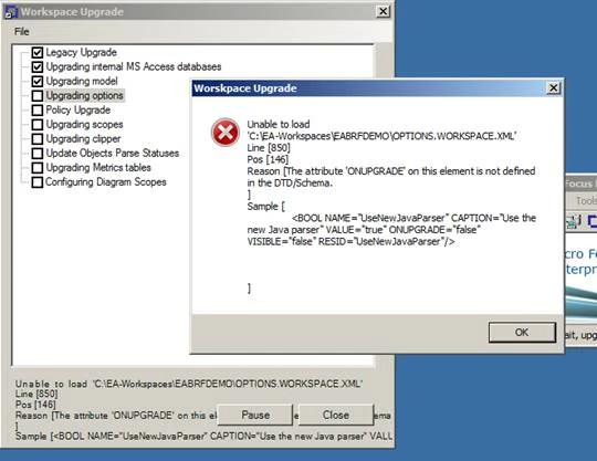 The error message shows a problem with attribute "ONUPGRADE" within the OPTIONS.WORKSPACE.XML file, which is in the WORKSPACE directory..