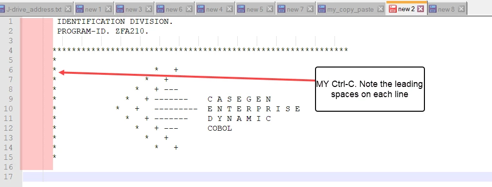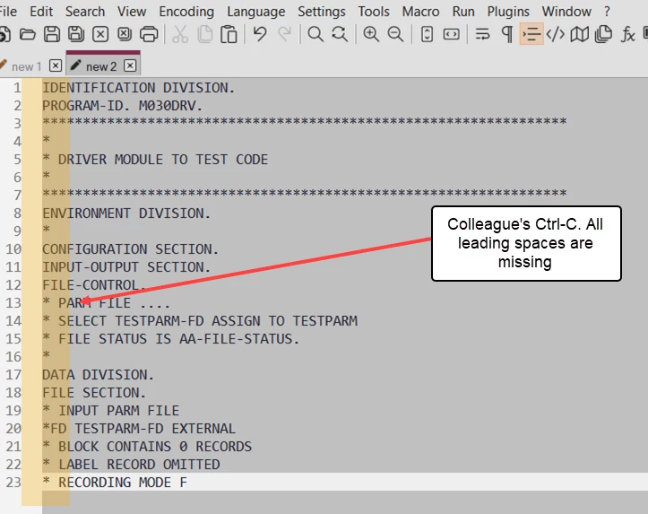 Every time he tries to do a Ctrl-C on the mainframe by dragging the cursor to mark the block of text he wants to copy, presses Ctrl-C and pastes it into, say notepad++, leading spaces are removed and imbedded multiple spaces are changed to the tab character (hex 09).