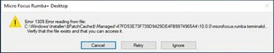 Encountering “Error: 1309: Error reading from file:” when attempting to uninstall Rumba 10 hot fix on a Windows 10 system.