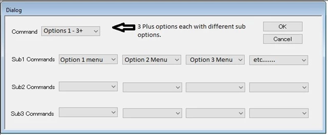 I need to have cascading DropListBox's for a menu that builds a string. For example if DropListBox1 has three plus options it will display DropListBox2 to DropListBox4 below it depending on selection. Each subsequent DropListBox will need to hide/reveal the appropriate DropListBox selection. I'm unsure if this would best be done by having multiple sub DropListBox's and have them display or hide depending on previous menu selection like the bad example image or if I should propagate each DropListBox with an array. Which would be more efficient? I've been unsuccessful in both hiding / revealing and propagating with arrays. The goal of the dialog box is to create a string that it sends to the terminal. I'm an end user, not a developer but I am putting in earnest effort to learn.