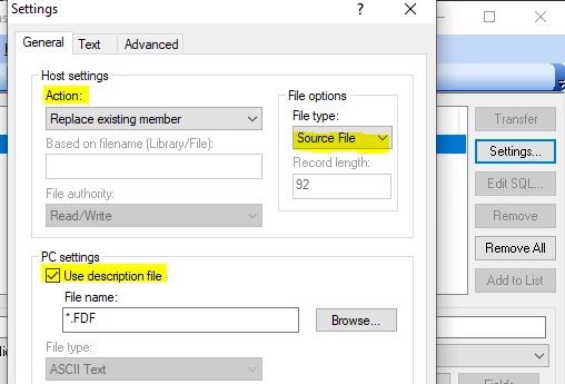 There are a lot of factors that can affect the transfer. This session appears to be configured for batch file transfer. You can also choose FTP which will present a different dialog. If you have a working client compare the settings for this file to see if changing the value for the File type, description file, or source type has an affect on this issue.