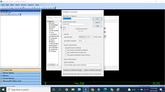 We want to use TLS v1.2 for our EXTRA! X-treme 9,6. When we try to connect with the Security Type set to TLS v1.2, we only get the lightning 501 message at the bottom of the screen. Here is how we set up the Configure Connection screen: