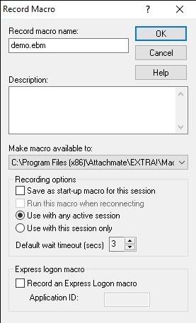 I have been trying to record a macro to perform the same actions again. I'm able to record the macro. But when i stop the recording the recorded macro is not getting saved. I'm getting error like "unable to save the file, due to the file format". So, i have tried giving the macro name.ebm while starting the recording. Even after doing it I'm getting same error. I'm using attachmate Extra! X-treme.