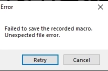 I'm not able to record and save the macro, and also record pages option is also not working. In both options after clicking on the stop button , I'm getting the above attached error.
