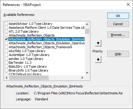 from the MS VBA user interface add a reference to Attachmate_Reflection_Ojuects_Emulation_Ibmhosts