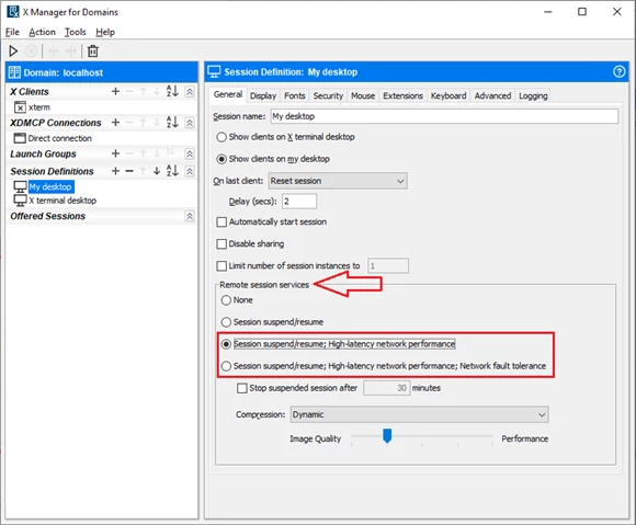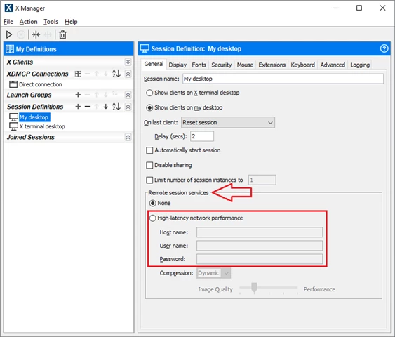 Performance can be enhanced over latent connections by enabling a feature in X Manager and X Manager for Domains entitled Remote Session Service, in addition to running either Remote Session Services or a Reflection X Advantage Domain node on the X client host or another system in the same LAN as the X client host. In this scenario, the round-trip communications will occur in the LAN without latency.