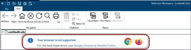 When accessing some websites, the "Your browser is not supported" message dialog can appear in a Reflection Desktop web session.