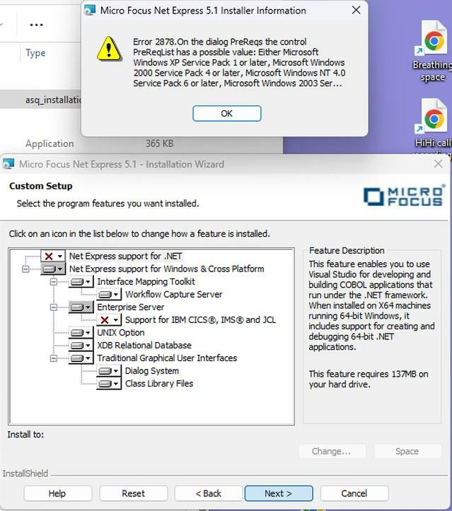 When I try I get an error message "Error 2878. On the dialog PreReqs the control PreReqList has a possible value: Either Microsoft Windows XP Service Pack 1 or later, Microsoft Windows 2000 Service Pack 4 or later, Microsoft Windows NT 4.0 Service Pack 6 or later, Microsoft Windows 2003 Ser ..."