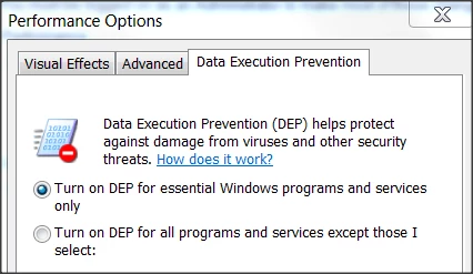 then it would be worth to make sure that the Data Execution Prevention (DEP) setting in Windows is set to "Turn on DEP for essential Windows programs and services only", not to "Turn on DEP for all programs and services except those I select"