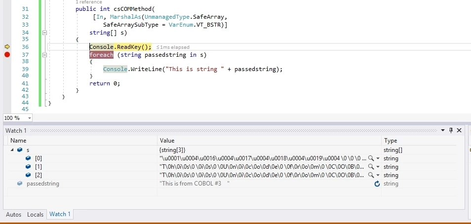 I put together a real simple example that demonstrates invoking a C# COM Server and passing in both a SafeArray storing PIC X data items as strings and a SafeArray storing PIC N data items as strings. The C# COM Server will display all the items passed in for each one.