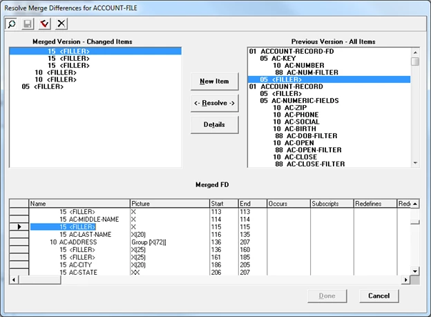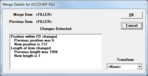 Well since the last time that I did the merge the fillers are showing but this position and length are not right. This is the file fd for this first filler. It should be what the previous was. Plus when I create my tables it also comes up with a message to rename the filler because it is not a valid sequel name, or i can click the cancel button to skip.