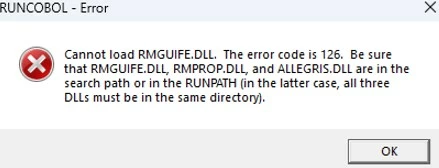 I'm running a program with an old version of the RM/COBOL runtime. After the recent Windows 11 update (08-2025), the runtime no longer works with the following error: "Cannot load RMGUIFE.DLL..." (see attached file).