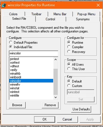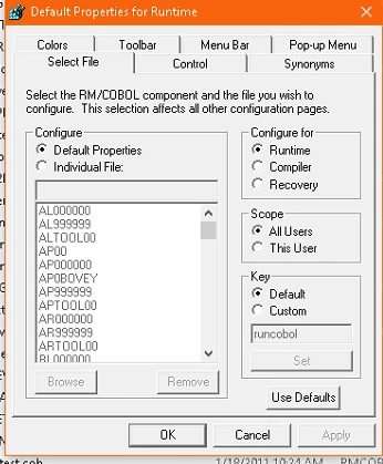 Some Windows updates are removing the registry settings for the COBOL programs. The screenshots attached are an example of how it looks when the settings are erased. The other image shows how it should look. The synonyms tab holds the path for the programs. Unfortunately, there is no way to determine which workstations will lose these settings. It does not seem to be associated with a particular version or build. In order to resolve, the ini2reg needs to be run and re associated with the runcobol.ini. |