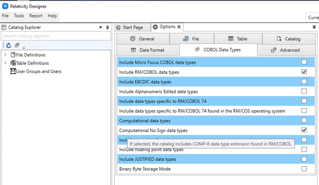 RM/COBOL supports the standard Packed Decimal Cobol data type of COMP-3. It also supports an extended Packed Decimal data type COMP-6. To be able to correctly map a file that contains COMP-6 fields, there are two Cobol Data Types options that need to be set before the file is imported into the catalog.