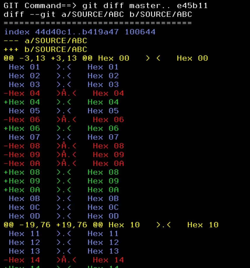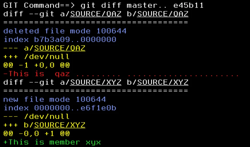 Below is the output of a "git diff" between the master branch with a selected commit e45b11. This was using Git for z/OS release 2.14.