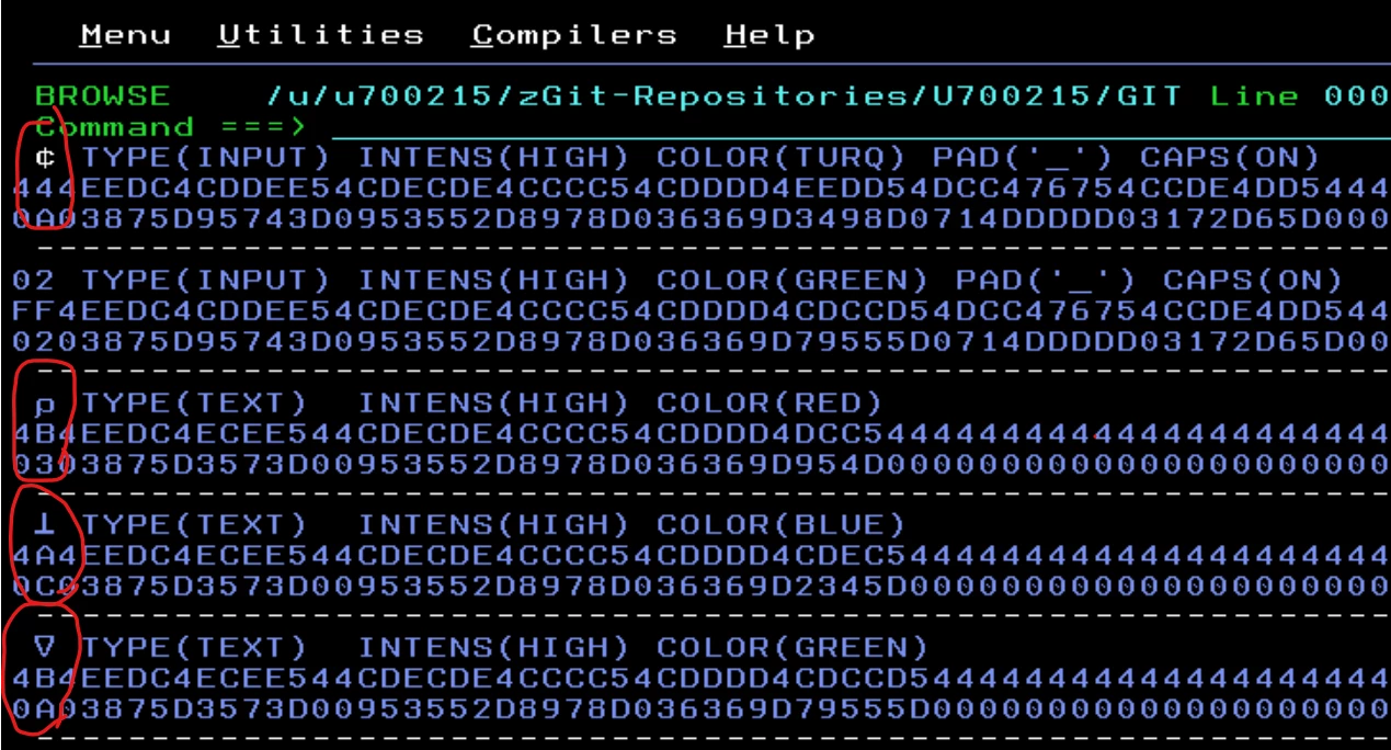 You can see some of the EBCDIC characters have come back as 2 bytes instead of one. I'm guessing the EBCDIC characters were translated to a 2 byte UTF-8 character when save in Git but after it was brought back by the Git Show command the 2 byte character has not been converted to the single EBCDIC character. Note: that a Git Checkout does not have that problem, the 2 byte UTF-8 character is brought back as a single EBCDIC character.