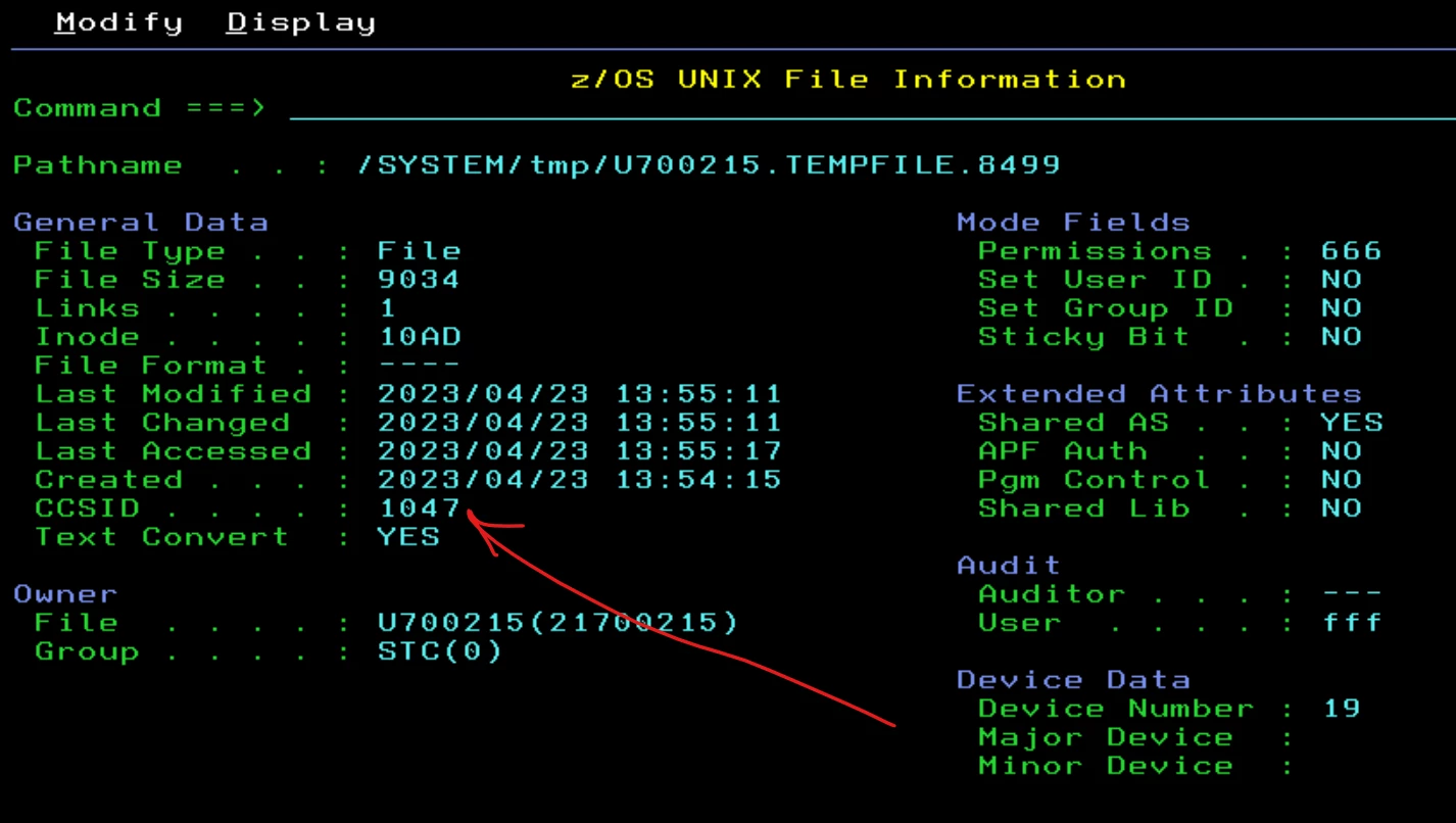 You can see below the temporary file did get tagged as IBM-1047 and the show did put data into the file.