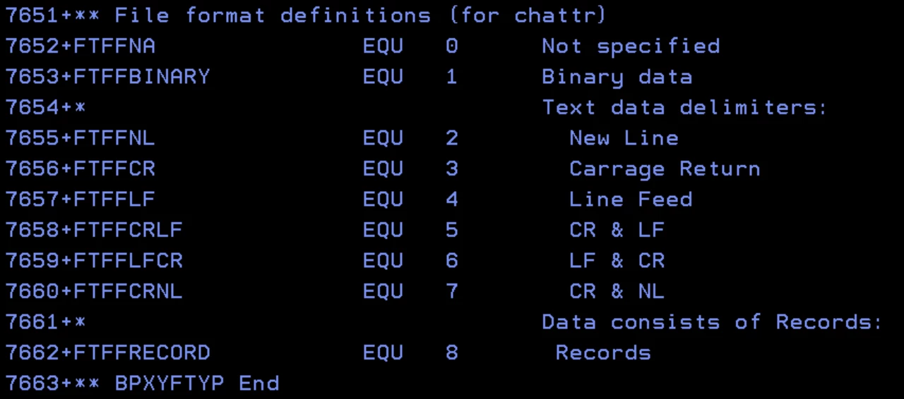 I am no USS guru, having spent my career in the traditional MVS environment. So to my surprise, during the writing of my assembler program, I found that each USS file also had a file format as seen here from the BPXYFTYP macro: