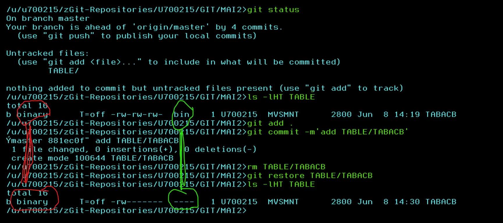 With Git for z/OS not preserving the file format, my ISPF tables which had a file format of binary were being transfers as text and any X'15' in the table were considered EOL characters, creating invalid tables.