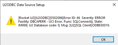 Failed:ERROR [00000] [Rocket U2][U2ODBC][0302086]Error ID: 46 Severity: ERROR Facility: DBCAPERR - UCI Error. Func: SQLConnect(); State: IM998; U2 Database code: 0; Msg: [U2][SQL Client]ODB930019.