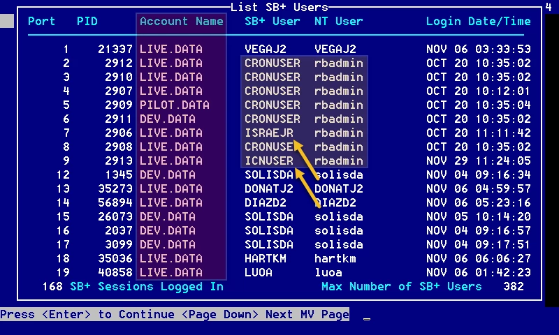 Port, Pid, Account Name, SB+ User, NT User, Login Date/Time