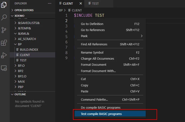 User can right click a file in the editor to display context menu and select "Test compile BASIC program".