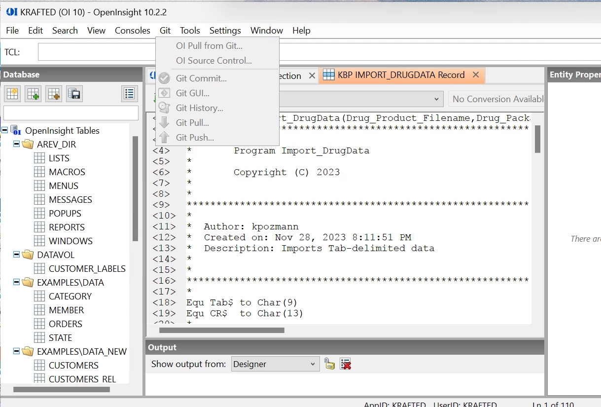 Revelation software has a GIT interface which you can use to manage code in Universe via their MVBFS which attaches Universe tables. Here is a screen shot showing a program that resides in Universe being edited with OpenInsight's full text editor. You can also use it to create very nice Windows desktop applications. In this particular example GIT is not enabled but you can see the menu options.....