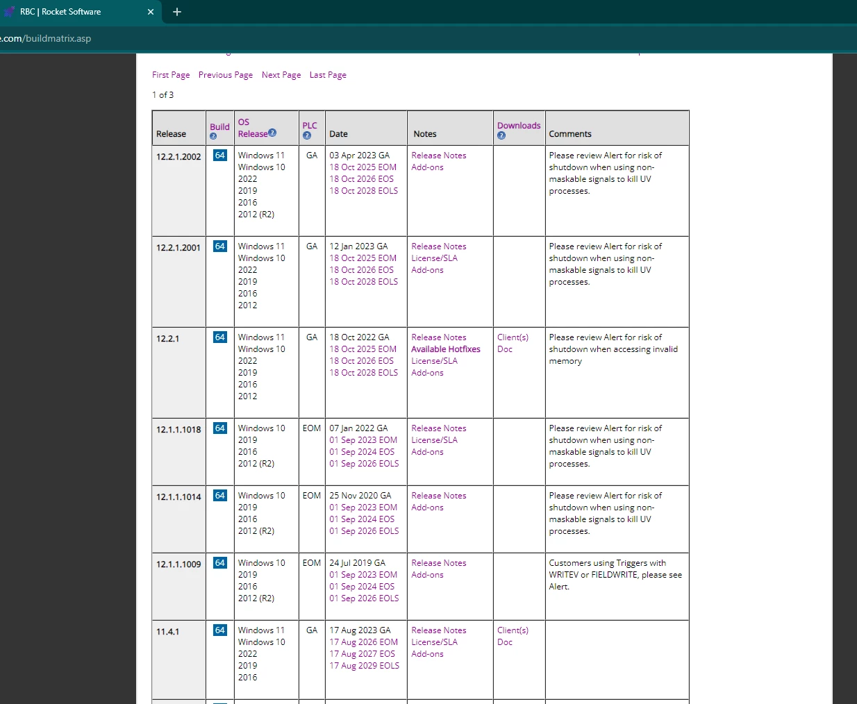 Rocket MultiValue maintains a standard Product Lifecycle policy. To view the lifecycle for your version of UniVerse and related tools, review the lifecycle dates and statuses on the Product Availability Matrix (PAM).