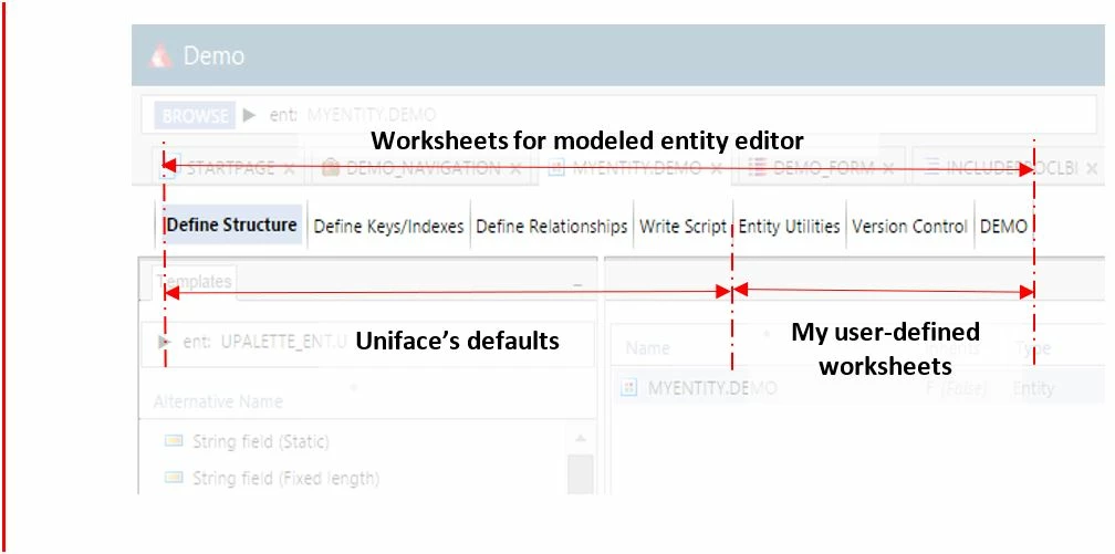 In Figure 3, the Uniface default worksheets are shown and next to them are my own worksheets. In another article on ‘Enhancing the provided toolset’, I described how these worksheets can be added to your preferred Uniface editor(s), to make your work as a Uniface developer even more efficient. The worksheets offer great flexibility and power. In your own worksheet(s), you are not bound to the tool panes Uniface is using, and your actions have unlimited scope. You, the developer, are completely free to add a worksheet that performs actions outside the open object, though it is advisable to take the context of the object into consideration.