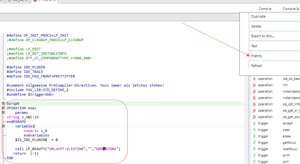 In UF9 (and U10 too) I do have as an addition a simple form with a text field: Paste proc code into it, then press "prettify" and then copy&past it back to any trigger I want e.g. into globale procedures or includes.