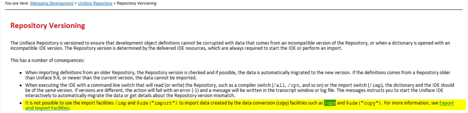 So if one is exporting/importing from/to the same UnifAce version is the same then /cpy