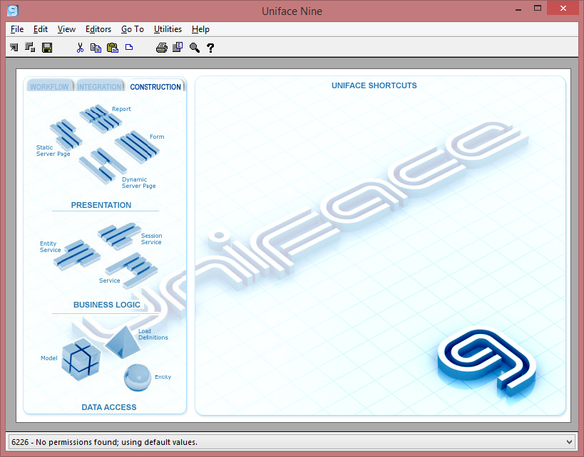 Instead of the Construction, Integration and Workflow workspaces we now have Mobile, Web, Desktop and Integration workspaces. We had to make a change here anyway because the Workflow workspace was not relevant anymore. This gave us the opportunity to better present the capabilities of Uniface. Each workspace only shows a limited set of Editors, the ones we think are the most used in that workspace. All Editors are still accessible through the menus, in exactly the same way as before. We have used the new Command Button properties that are available in Uniface 9.7 to make the big workspace buttons like tiles.