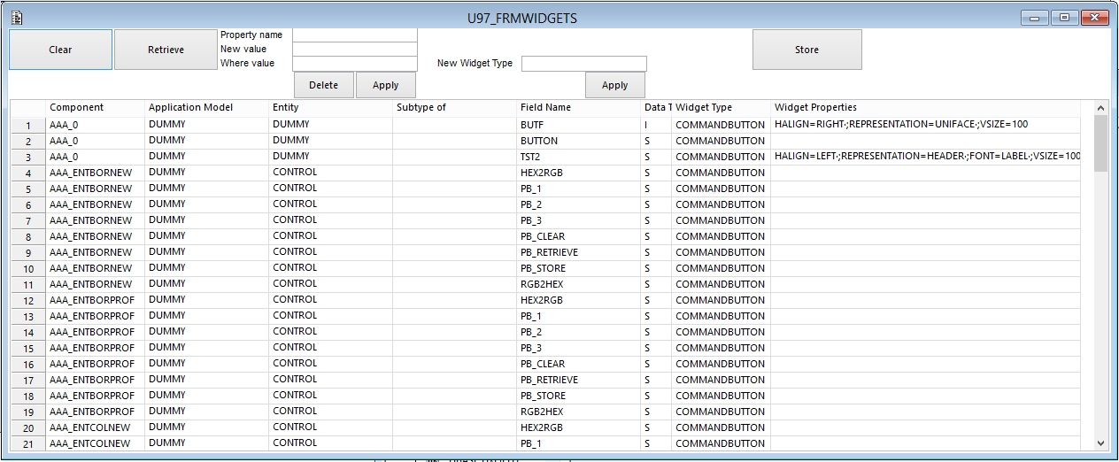 Splitting the Command Buttons in these five logical widgets was a lot of work so I made a tool to assist in this mostly-manual step. I used the tool to query for fields with a Command Button widget, and in another window I looked in the IDF what new logical widget it should be. The main advantage of the tool for this step was making sure that I did not miss any buttons. The tool is called U97_FRMWIDGETS. You can enter a retrieve profile and then work on the properties of the found painted fields. You can delete a property regardless of its value, or only when it has a specific value. You can also Add (or replace) properties in four ways: apply it to all records, do not replace existing values, only replace existing values, only replace a specific existing value. You can also apply a new widget type to all records.