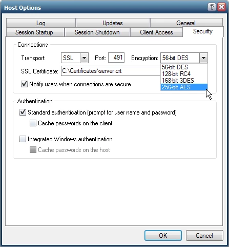Host Administrators can optionally encrypt all data transmitted between the client and the host. This includes the client’s user name and password, which are supplied during logon, and any application data submitted by the client or returned by the host.