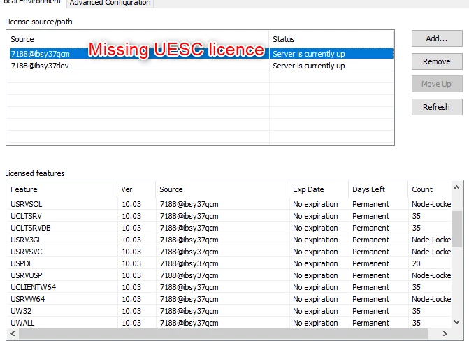 It seems that UESC is a security licence needed since Uniface 9.7.0.5 but this licence is missing in the xml licence provided : We have it in our xml licence for development host but not for our QC host (USRVESC licence is missing too)