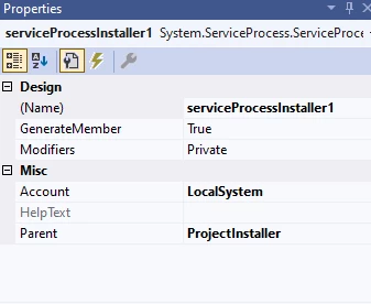 In the Design view for ProjectInstaller, choose serviceProcessInstaller1 for a C# project, or ServiceProcessInstaller1 for a Visual Basic project, then choose Properties from the shortcut menu. Set the Account property to LocalSystem from the drop-down list.