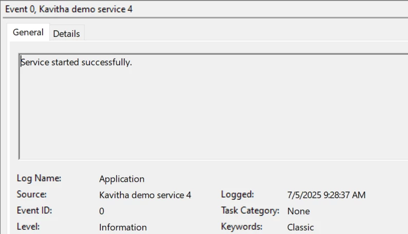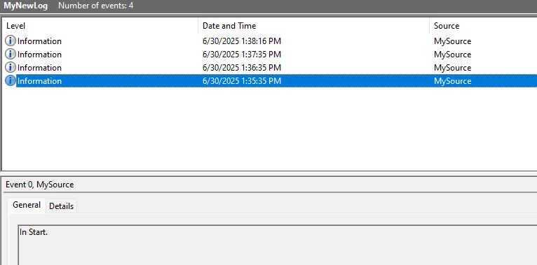 I believe I am logged in as LocalSystem account as I was able to write to event log using the code attached. Attached code is a pure Visual COBOL code (not Windows service program) when run using start command wrote the instructed messages to event log which was verified in the Event Viewer. But if I use the same Call WINAPI ReportEventA or WriteEntry() function in Windows service program, specified logs in the code do not reflect in Event Viewer.
