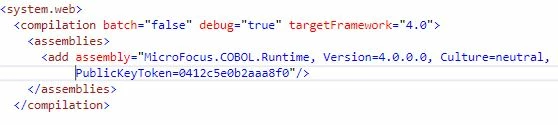 To allow COBOL data items to be used in the global.asax.cbl file you must add a reference to the assembly directly in the web.config file under the compilation section.