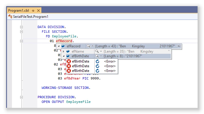 Today I launched my first debugging session with Visual COBOL and recognized a number of errors. I took a screen recording of my session. Please find the screen recording attached along with the project file in the attachment.