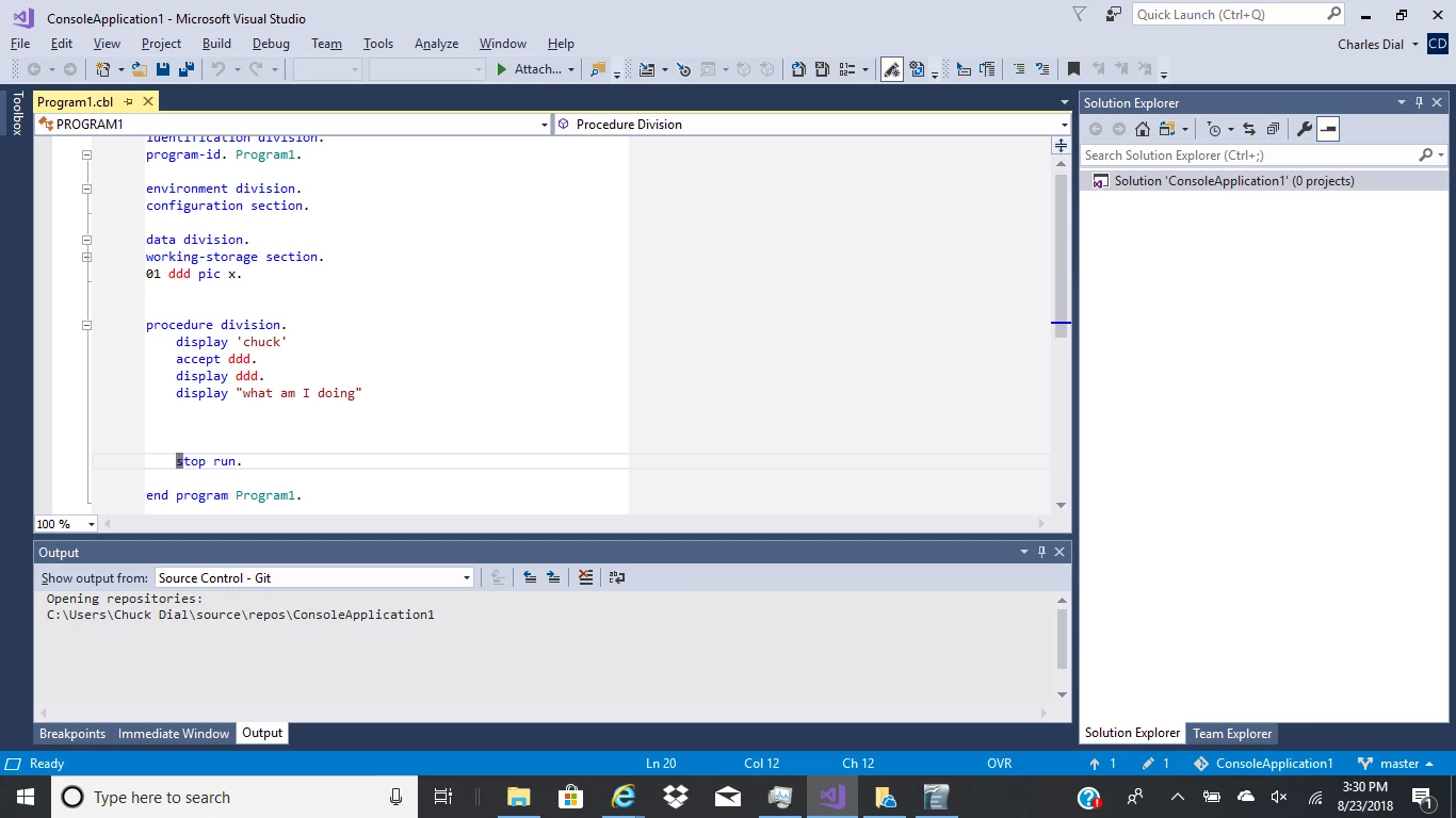 #VisualStudio#COBOLYou have not added the program to a project or the program and the project would show under the solution name in the Solution Explorer window. It looks like you are using source control for your programs.