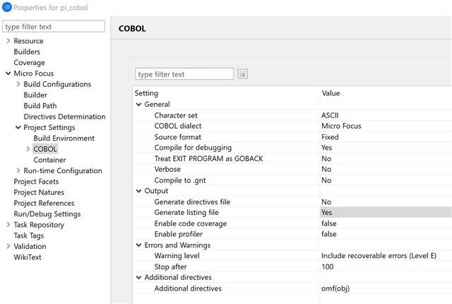 How to set compile option that makes Visual Cobol output it too ?