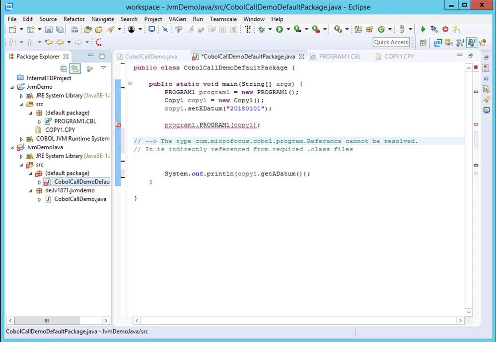 program1.PROGRAM1(copy1); <- doesn't work: The type com.microfocus.cobol.program.Reference cannot be resolved. It is indirectly referenced from required .class files