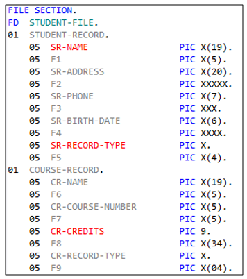 In the example below a data file has two record layouts STUDENT-RECORD and COURSE-RECORD.