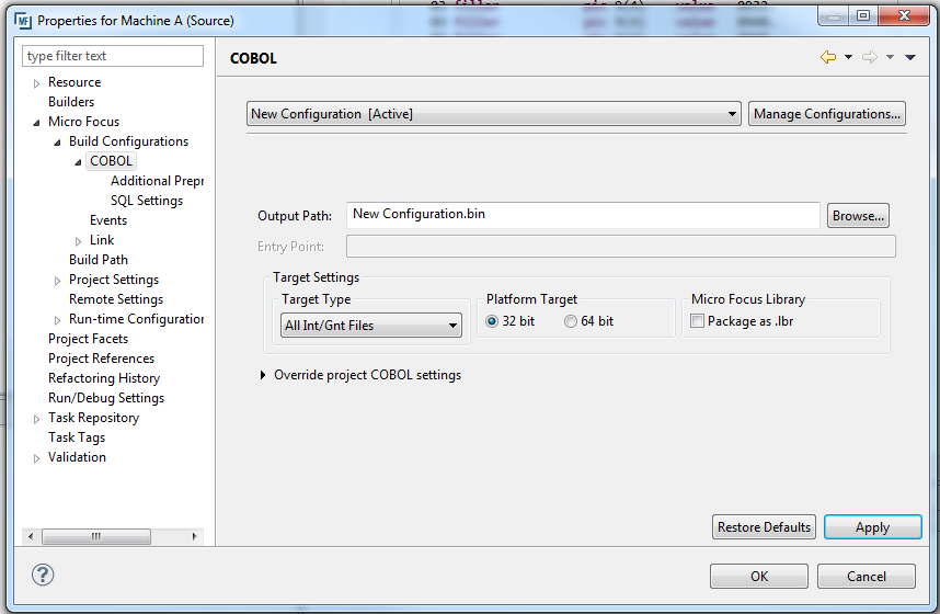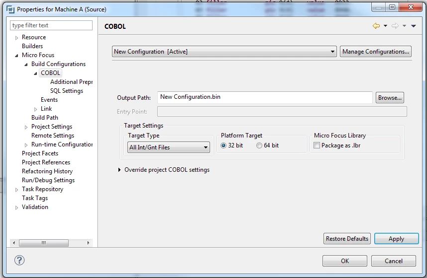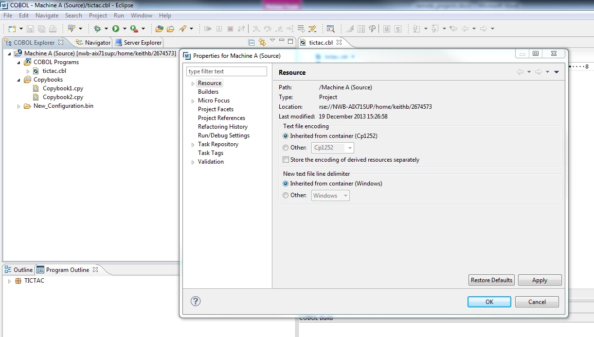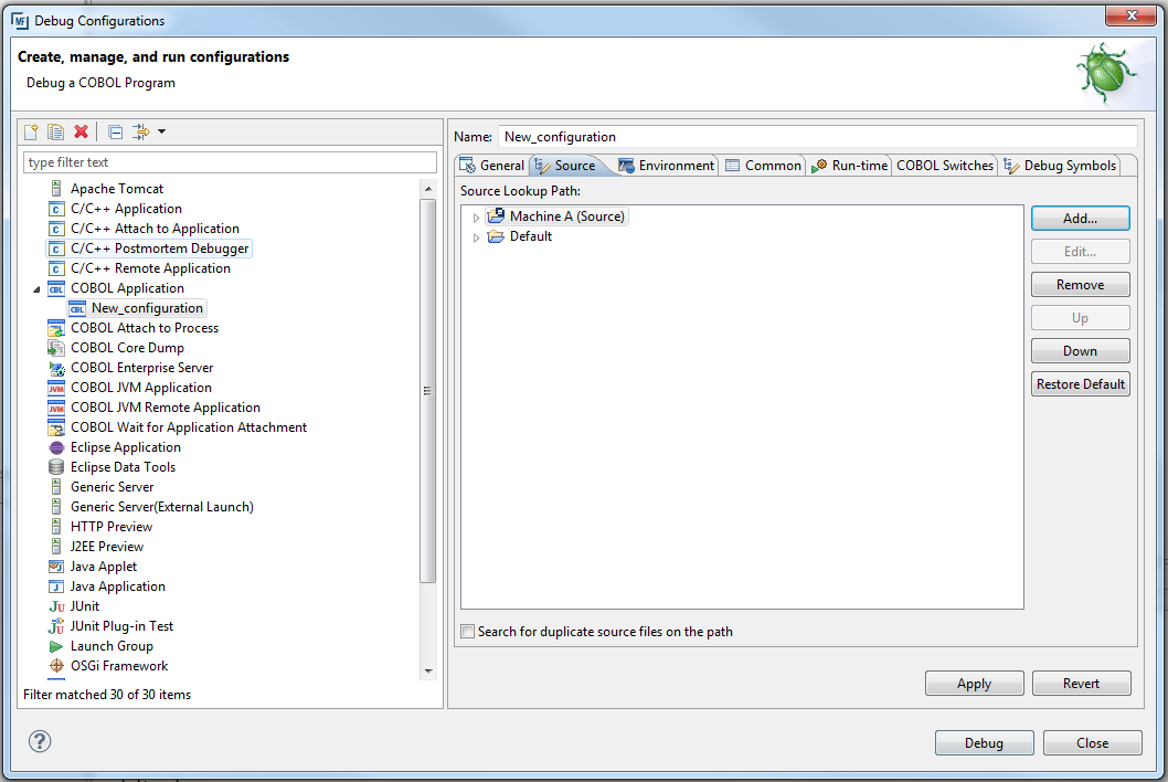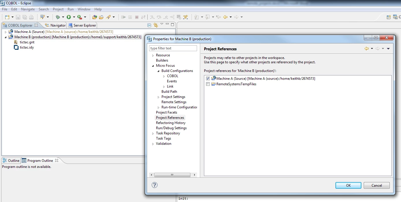In the Source tab add the remote COBOL Project on Machine A using Add, COBOL Project then select the Machine A project. The source tab should now look like this: