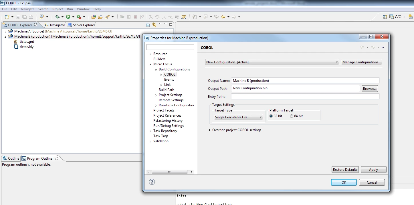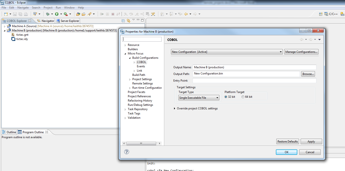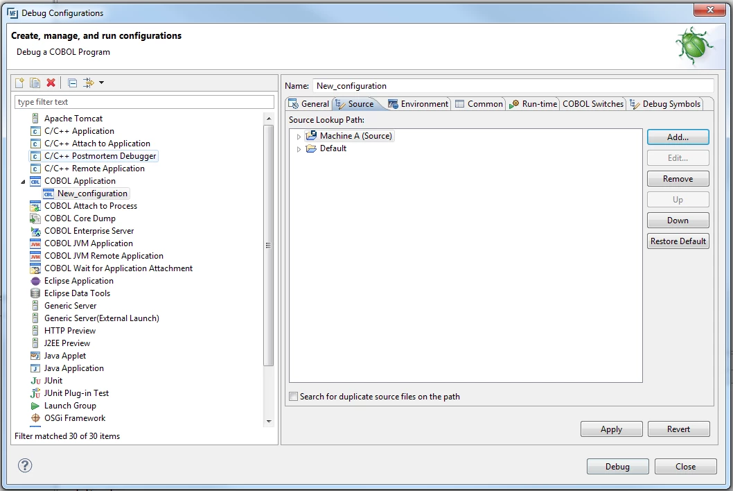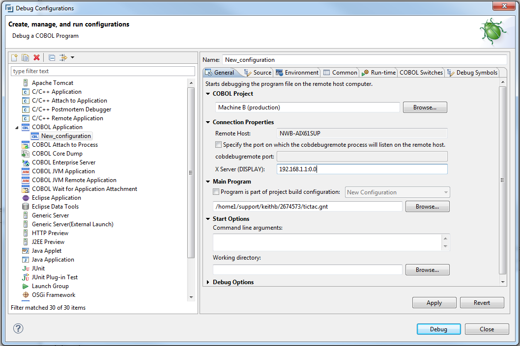 To debug you must create a debug launch perspective for a COBOL Application, de-select “program is part of a project build configuration” (under Main Program) and browse to the GNT file on Machine B.