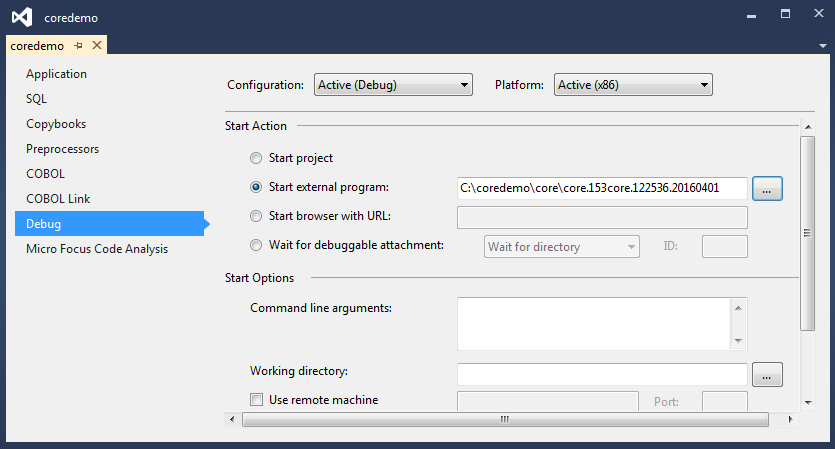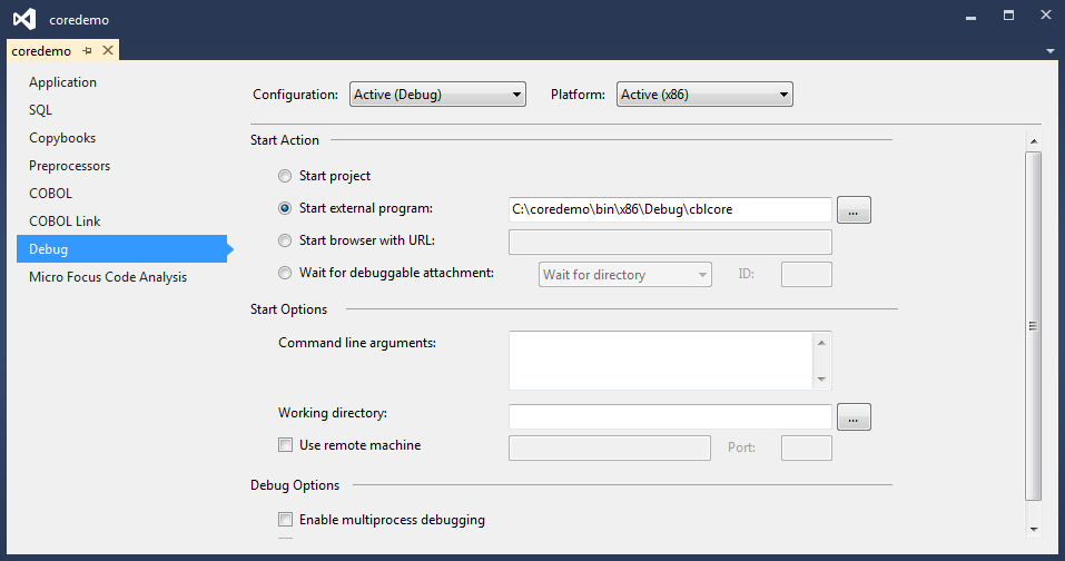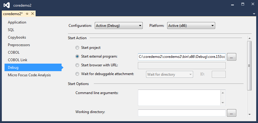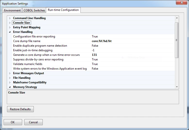 Some run-time behavior cannot be configured using the IDE; this must be configured using run-time tunables, which are set in a run-time configuration file. A text-based run-time configuration file should be created specifying the run-time tunables. Alternatively an application configuration file, Application.config can be used (see below). Additionally a core dump file can be created using CBLCORED (see below).