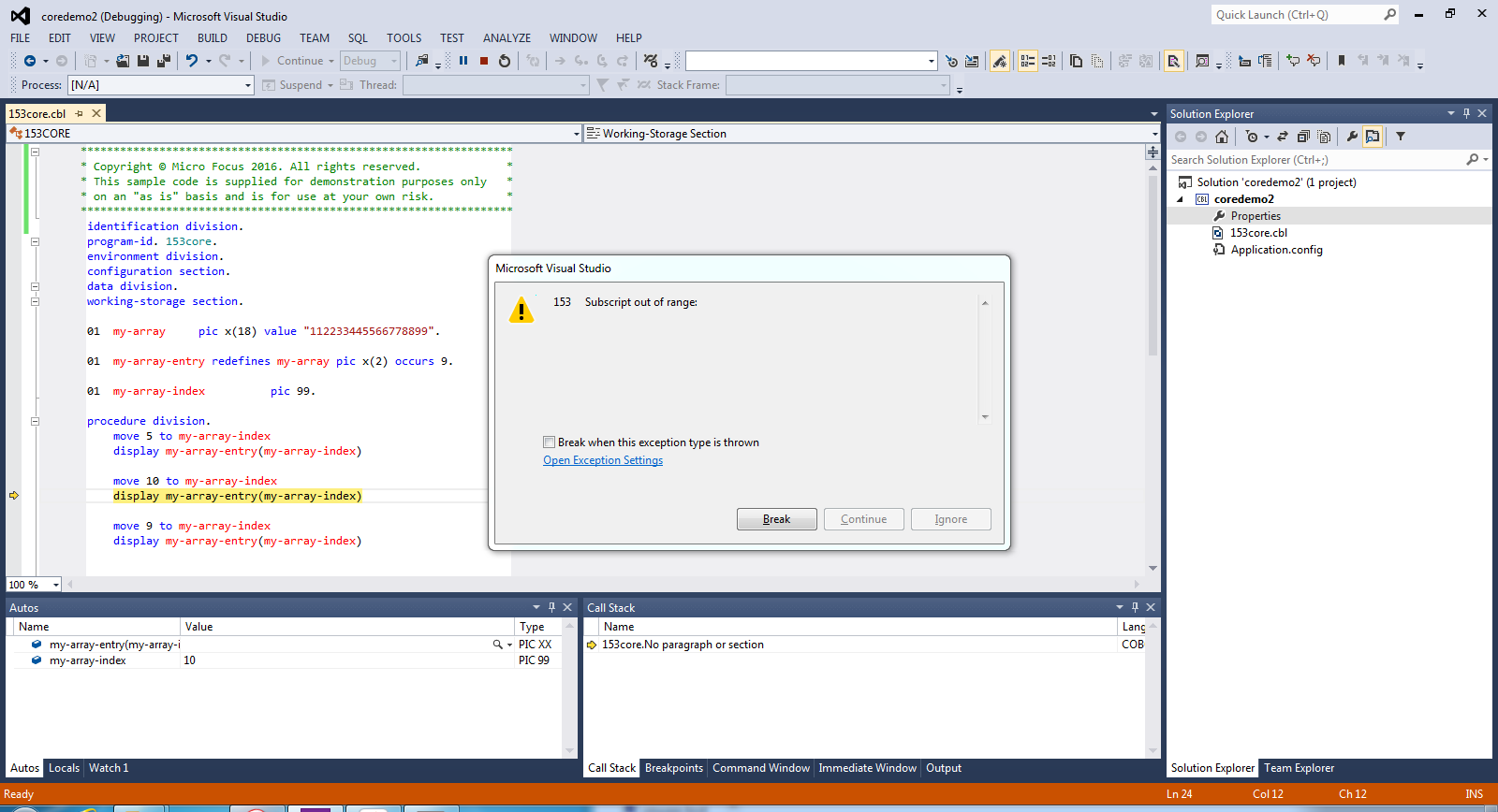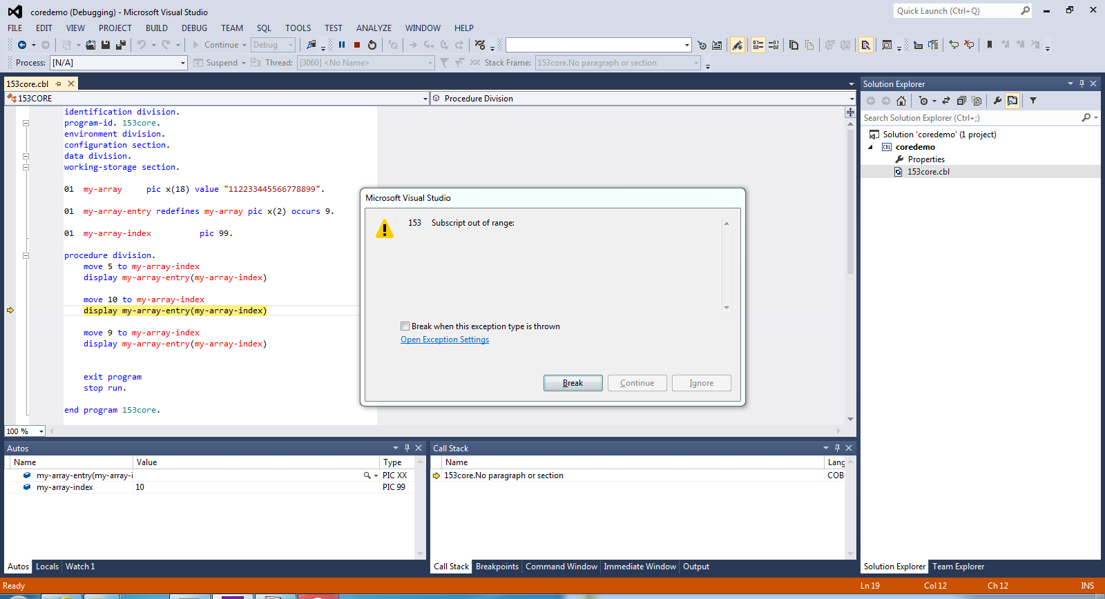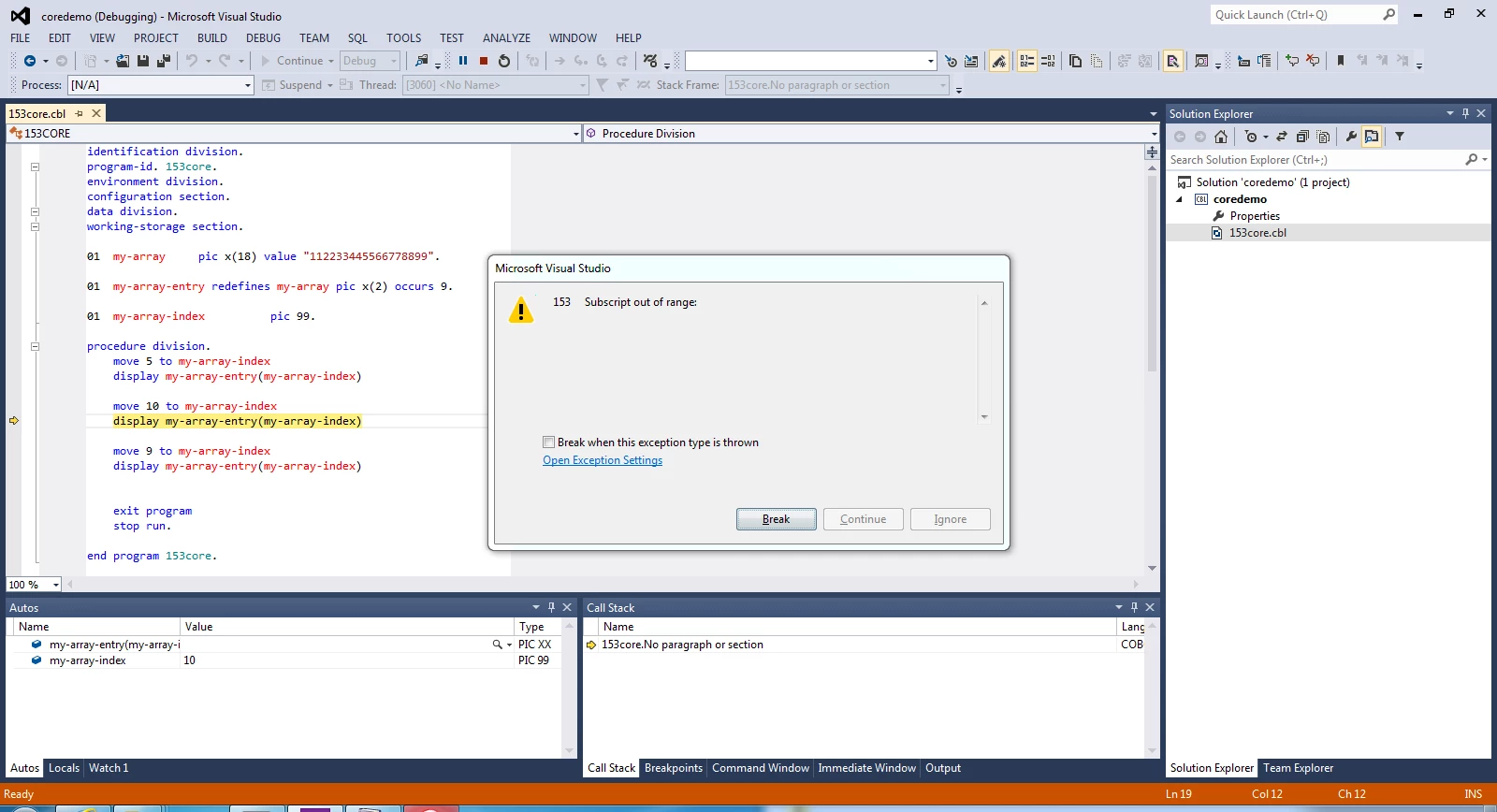 Start debugging; the state of the program when it crashed is displayed. The program can now examined at the point at which the crash occurred: